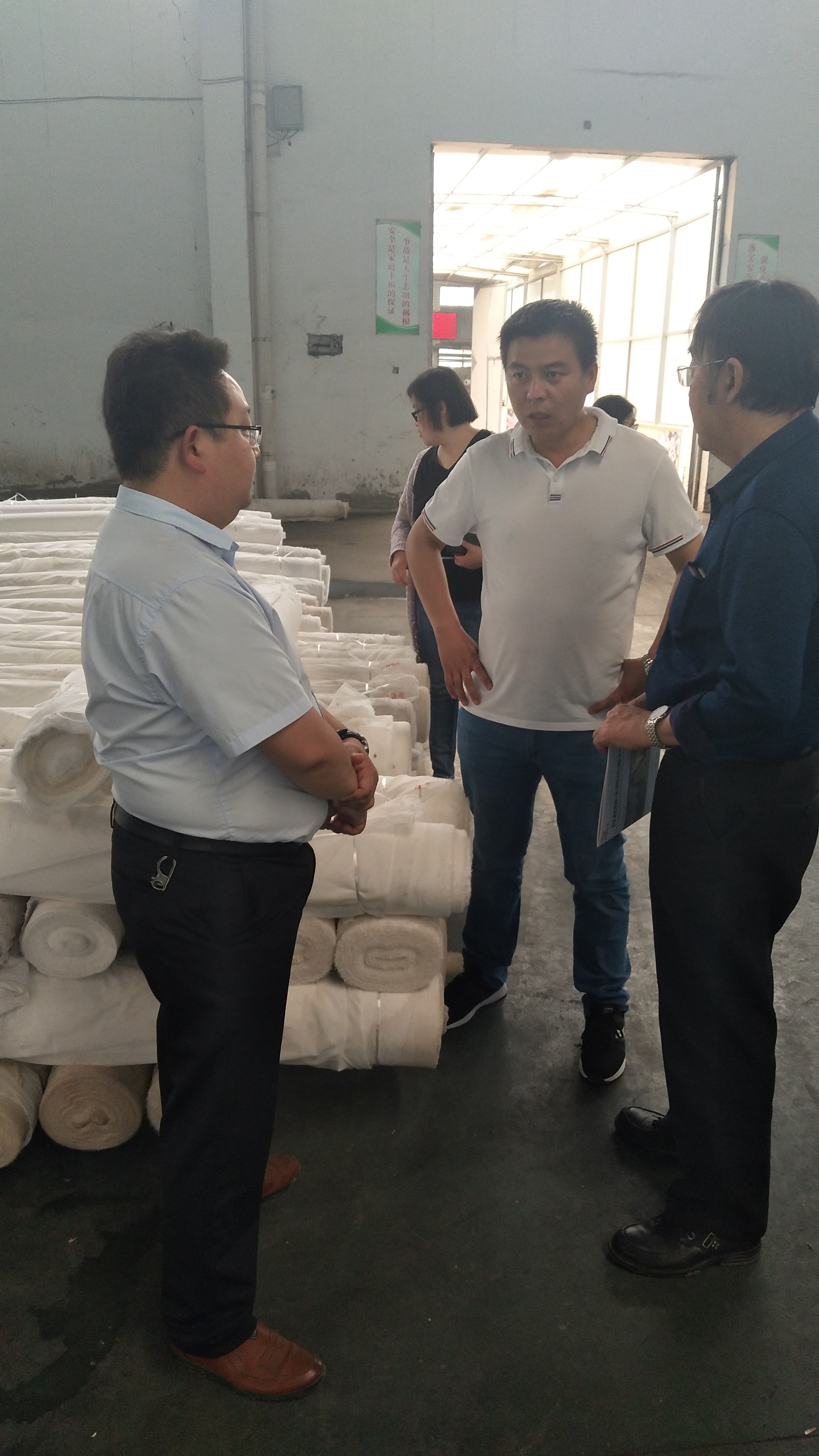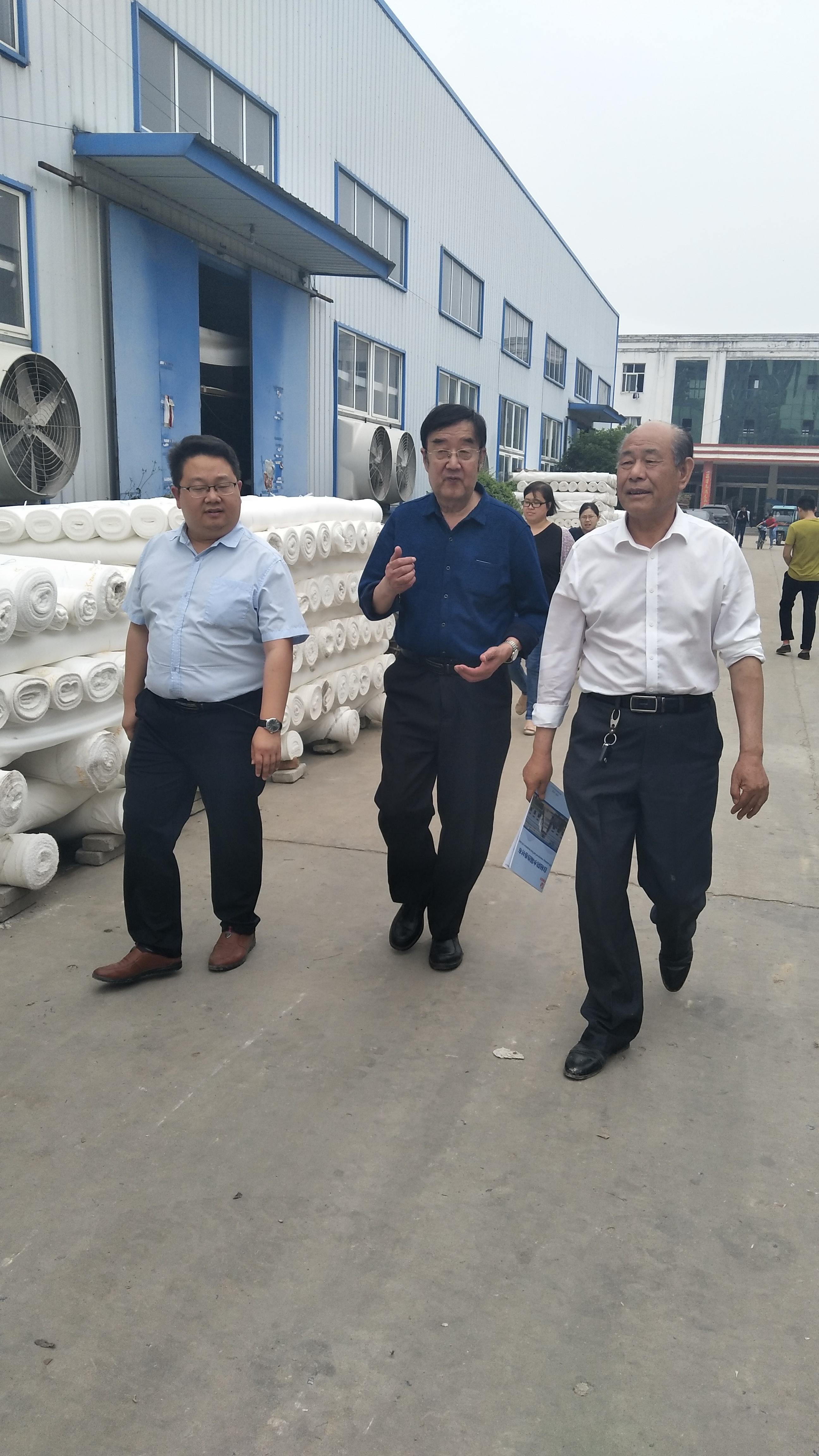 在淮滨县党委王副书记热情接待下,魏经理一行,先去“淮滨县龙海雨布制品有限公司”参观考察,曾庆国董事长陪同参观了防水材料制作车间,讲解防水材料专利产品,提出急需攻克的难题,就不干胶与防水材料接口粘结的改进提出了合作研发的可能性。